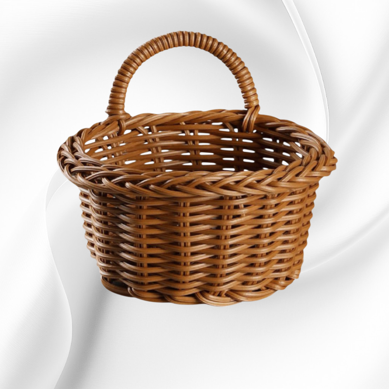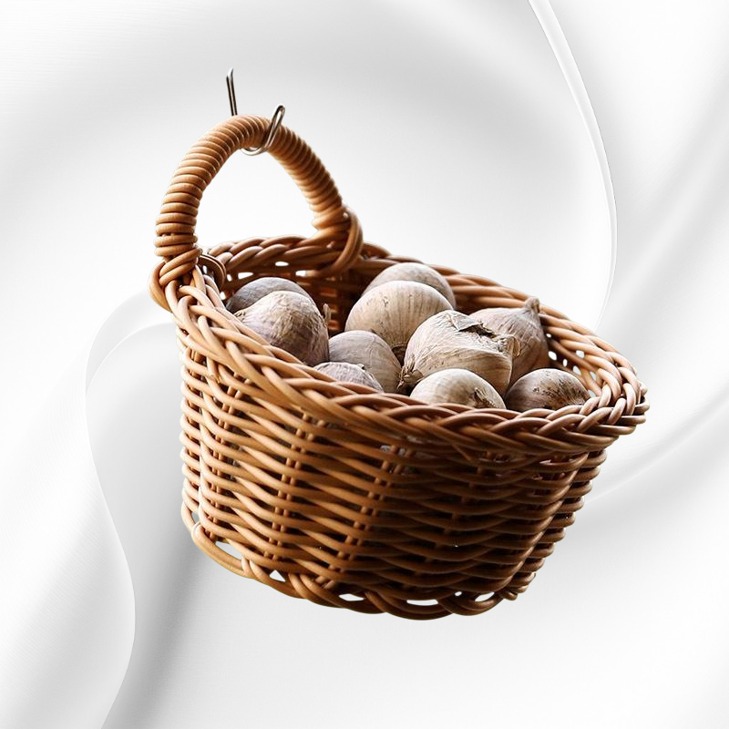 通気性の良いプラスチック製ラタン風デザイン。壁掛け可能で省スペース。キッチンのネギ・ショウガ・ニンニク収納に最適。お手入れ簡単。